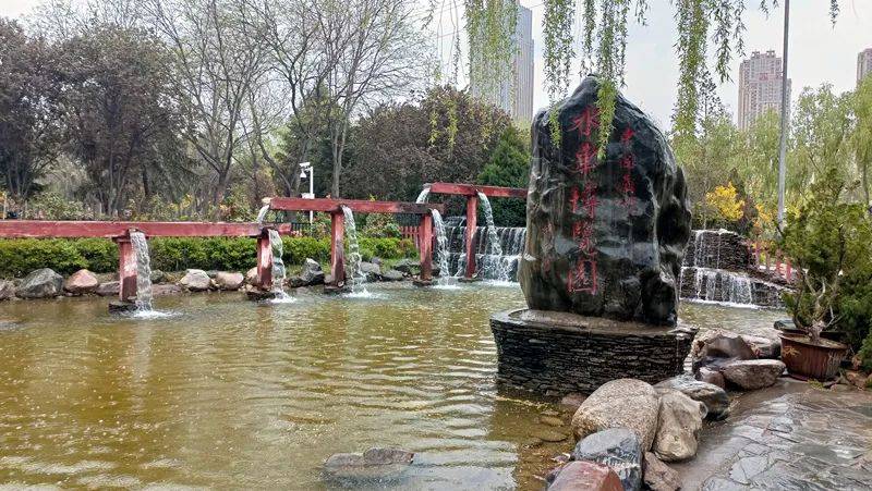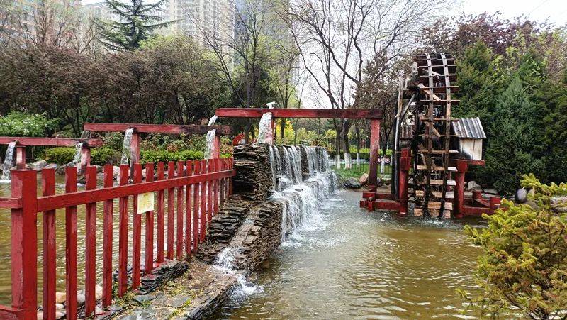 园内各种巨型水车令人大开眼界,间或有绿树成荫之地可供游人休憩。在园内一个粗壮的水车构件上,发现中国著名作家陈忠实先生为该园的题字:“园陈文石千年秀,河卷水车万古声”。字迹清秀,韵味十足,寓意悠远。