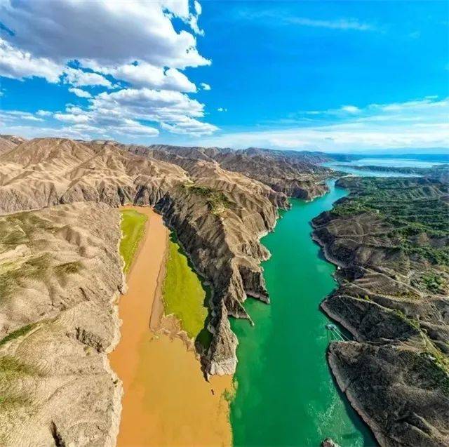在永靖县刘家峡大坝附近,黄河与洮河以“Y”字形交汇,形成了“黄洮交汇”的奇观。黄河水清澈碧蓝,而洮河则因携带大量泥沙呈现浑浊的黄色,两者相遇却不相融,形成了一条鲜明的分界线,宛如一幅天然的“鸳鸯锅”画卷。