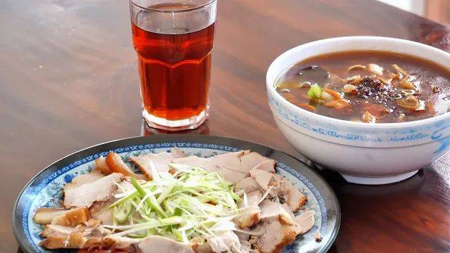 组成:一碗劲道的行面、一盘浓香软烂的卤肉、一杯暖胃解腻的红枣茯茶。